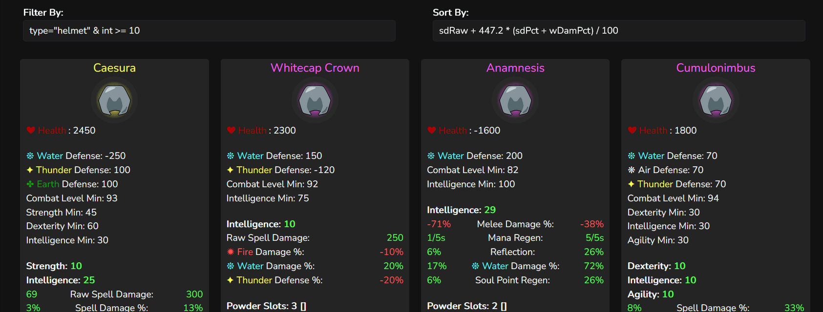 The WynnBuilder team has been hard at work giving you the latest and greatest tools for optimizing your most complex Wynncraft builds. Now, we're introducing WynnAtlas, the new, bigger, better, smarter, powerful-er item guide! Featuring an extremely flexible expression language for filtering and sorting items, WynnAtlas' advanced item search system gives build engineers the power to select items with a high degree of granularity. Picking components for your brand-new Divzer WFA build has never been easier!